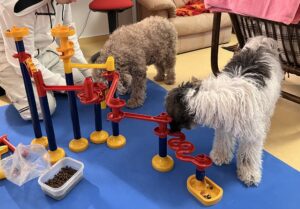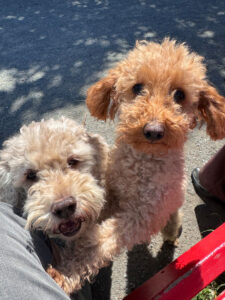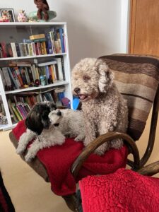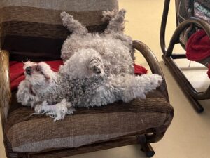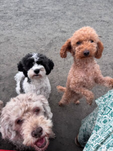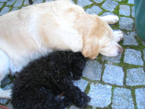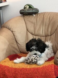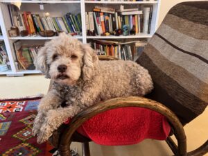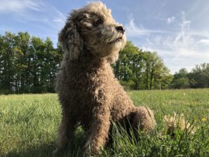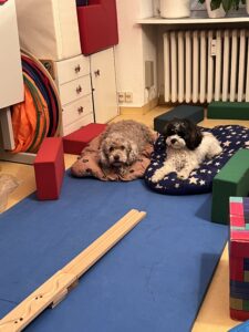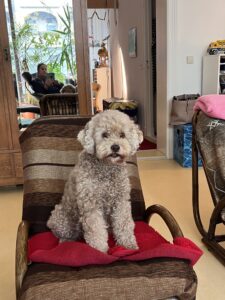 Mellin ist ein Toypudel, sie liebt es ruhig, ist freundlich und ein bisschen ängstlich, sitzt gerne irgendwo oben, auf Kissen, Schoß oder Sessellehne und flüchtet wenn es zu viel, zu laut, zu bunt wird ins Körbchen. Sie ist geräuschempfindlich, wenn sie was hört gibt sie Bescheid, hat Hundeangst, wenn die anderen Hunde zu wild sind und ist geschmacksempfindlich. Ansonsten ist sie gerne immer dabei, sie kann „Erdmännchen machen“, auf Hinterbeinen balancieren und vorsichtig Leckerchen nehmen und sie lernt gerne neue Tricks dazu.
